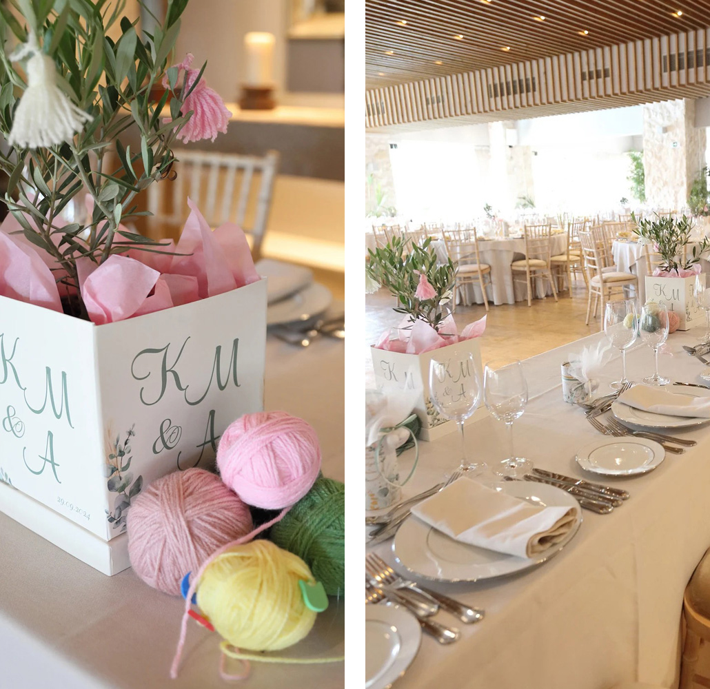 Κάθε τραπέζι στολίστηκε με ελιά, ροζ λεπτομέρειες και custom-made κουτιά με τα μονογράμματα της οικογένειας.