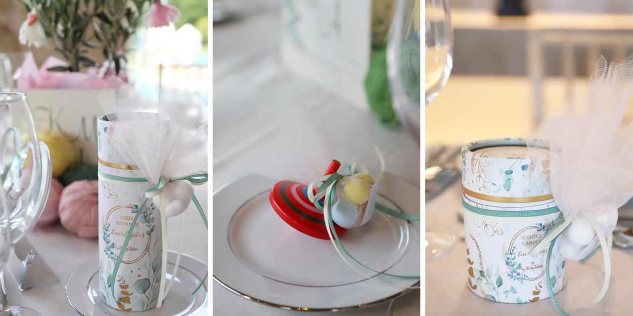 Οι μπομπονιέρες – αρωματικά χώρου και κεριά για τους μεγάλους, πολύχρωμες σβούρες για τους μικρούς – πρόσθεσαν μια γλυκιά νότα παράδοσης και φροντίδας.