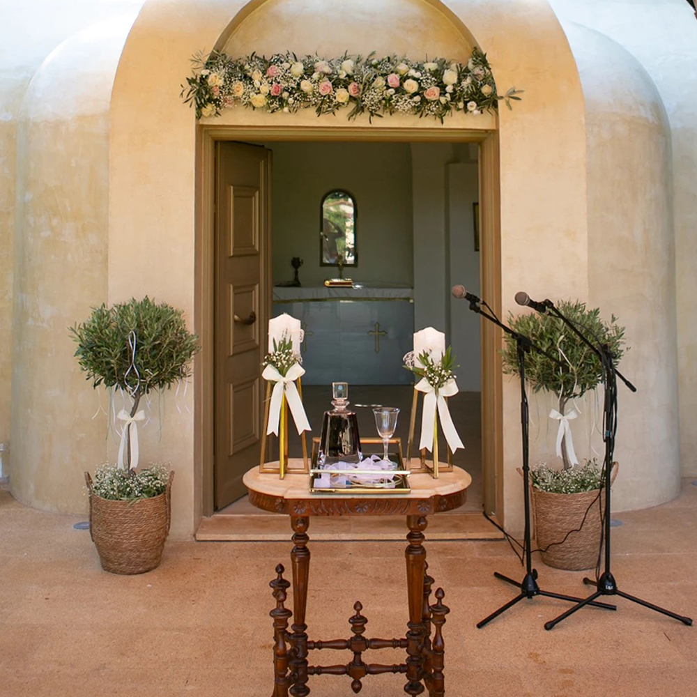 Η τελετή πραγματοποιήθηκε κάτω από αέρινη σκίαση, με καθίσματα σε φυσική απόχρωση. Οι ανθοσυνθέσεις από τριαντάφυλλα, γυψοφύλλη και ελιά στόλισαν την είσοδο του ναού και συνέθεσαν μια εικόνα ρομαντικής φρεσκάδας και διαχρονικής απλότητας.