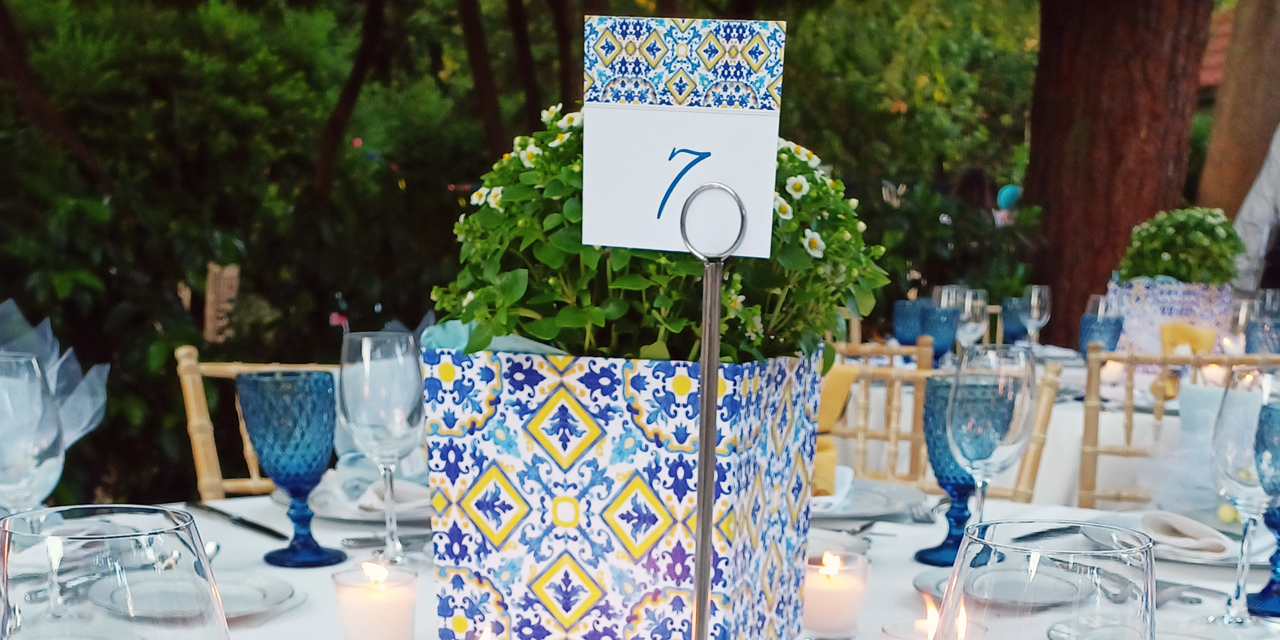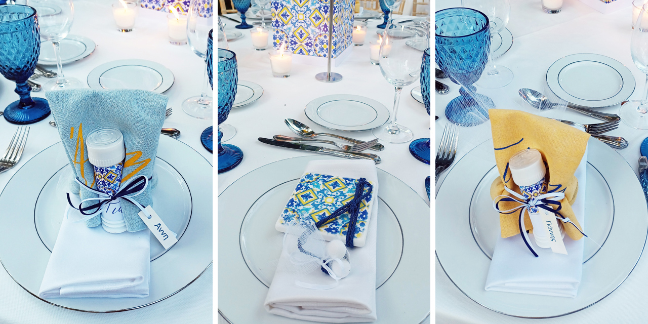 Στον χώρο της δεξίωσης, στο Μουσείο Γουλανδρή, κυριάρχησαν τα μπλε, κίτρινα και λευκά στοιχεία, εμπνευσμένα από τα ελληνικά κεραμικά μοτίβα.