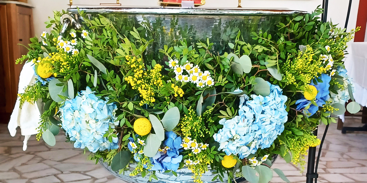 Η κολυμπήθρα στολίστηκε με μια υπέροχη γιρλάντα από σιέλ και μπλε ορτανσίες, κίτρινα άνθη και χαμομήλι, δημιουργώντας μια ρομαντική και ανάλαφρη σύνθεση που ταίριαζε απόλυτα με την καλοκαιρινή διάθεση της ημέρας.