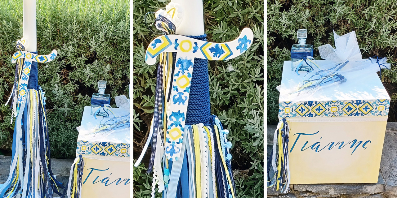Η λαμπάδα, το κουτί και τα αξεσουάρ στολίστηκαν με κορδέλες και διακοσμητικά στοιχεία που ολοκλήρωσαν αρμονικά το σύνολο.