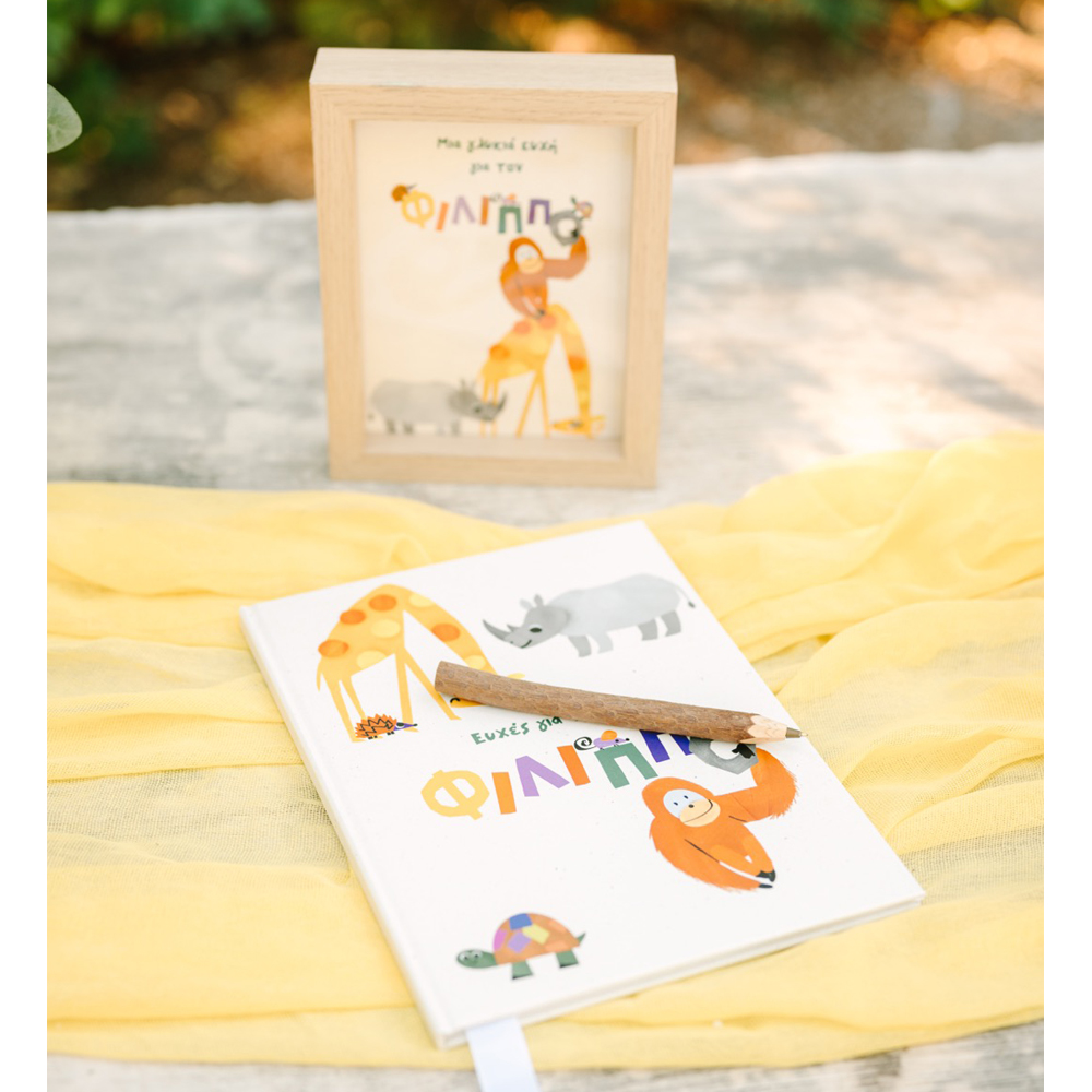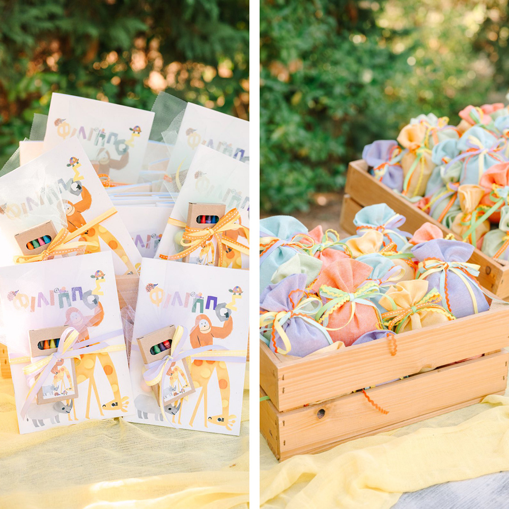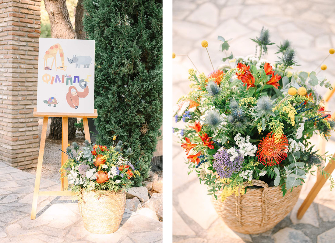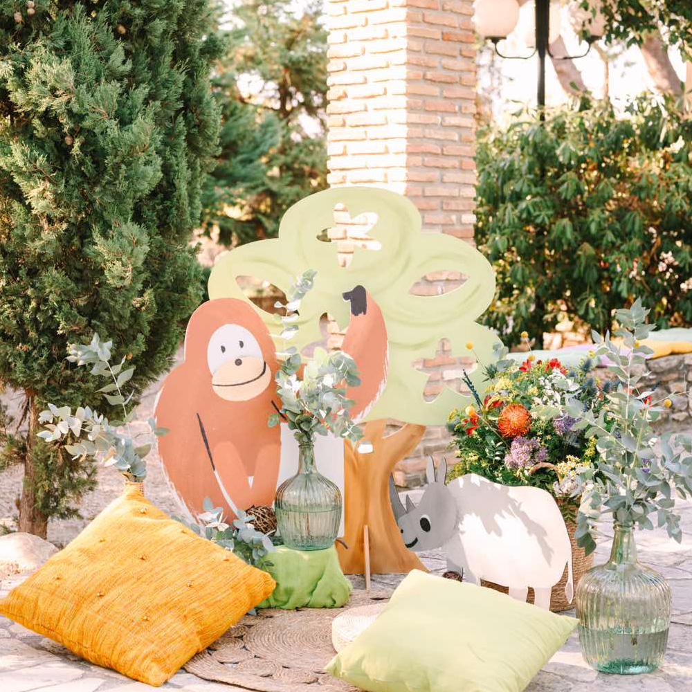 Η μαμά του Φίλιππου μας εμπιστεύτηκε το θέμα που είχε φανταστεί — έναν χαρούμενο κόσμο με ζωάκια, φυσικές υφές και γήινες αποχρώσεις — και εμείς αναλάβαμε τον σχεδιασμό από την πρόσκληση μέχρι και την τελευταία λεπτομέρεια της διακόσμησης.
