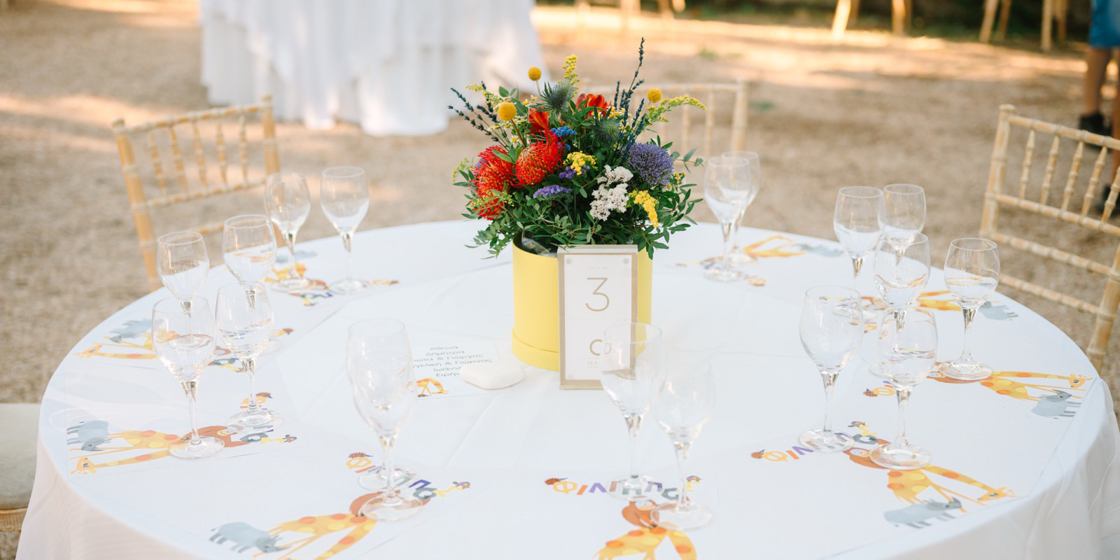 Στη δεξίωση, τα τραπέζια συνέχισαν το ίδιο concept με ειδικά σχεδιασμένα print σουπλά και στολισμό σε minimal γραμμές με πορτοκαλί και κίτρινες καπελίερες, ιδανικό για όσους αναζητούν ιδέες διακόσμησης βάπτισης με συνοχή και καθαρή αισθητική.