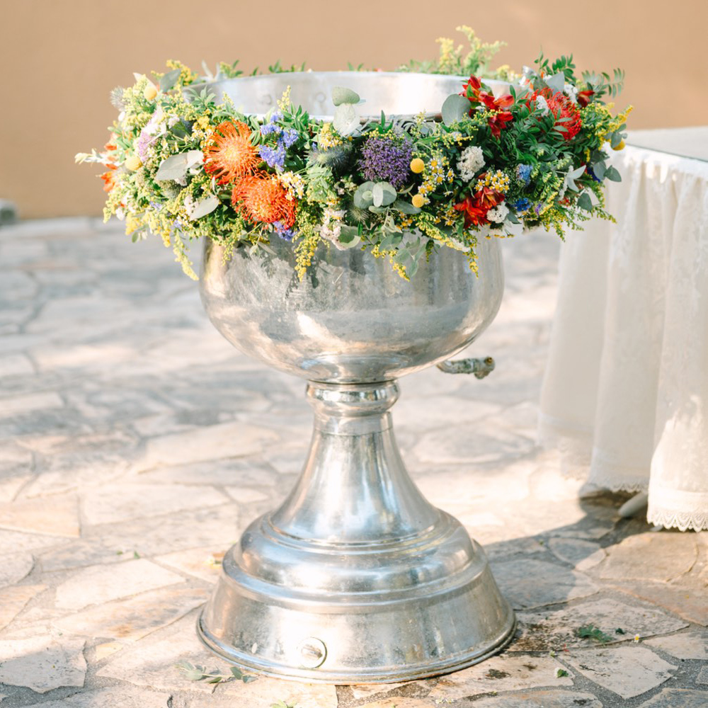 Η κολυμπήθρα στολίστηκε με ένα μεγάλο στεφάνι από λουλούδια σε ζωηρούς τόνους, ένα αποτέλεσμα που ταιριάζει απόλυτα με όσες αναζητούν στολισμό κολυμπήθρας ιδέες με φυσικό στυλ και έντονη χρωματική φρεσκάδα.