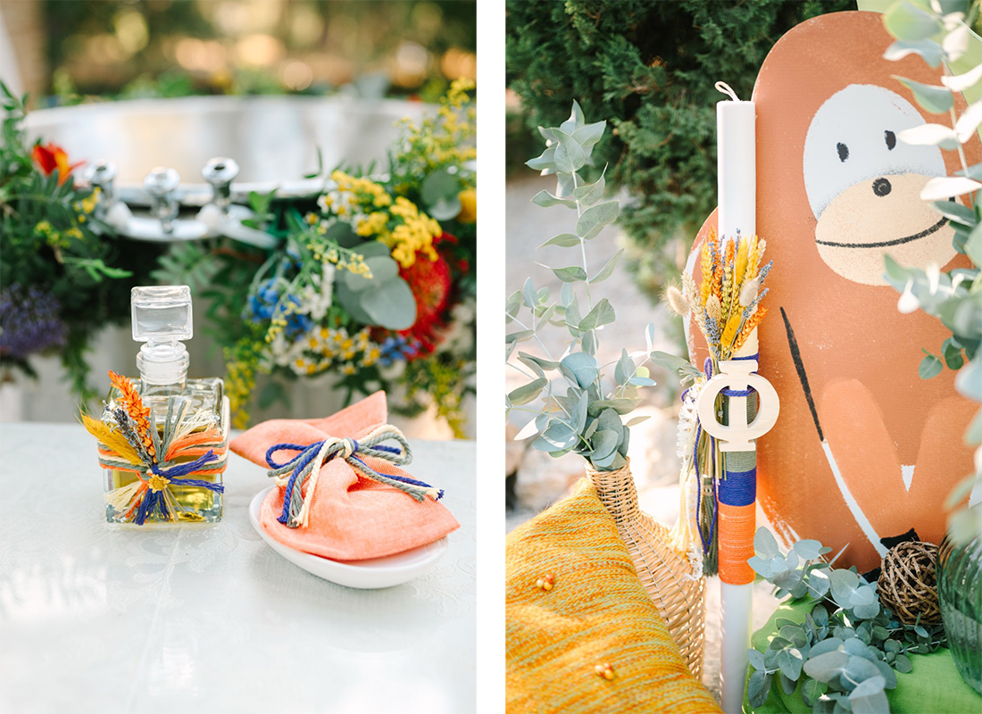 Η λαμπάδα και το λαδοσέτ φτιάχτηκαν στο χέρι, με υλικά που συνδέονταν με τον στολισμό της εκκλησίας και το γενικό ύφος της βάπτισης.